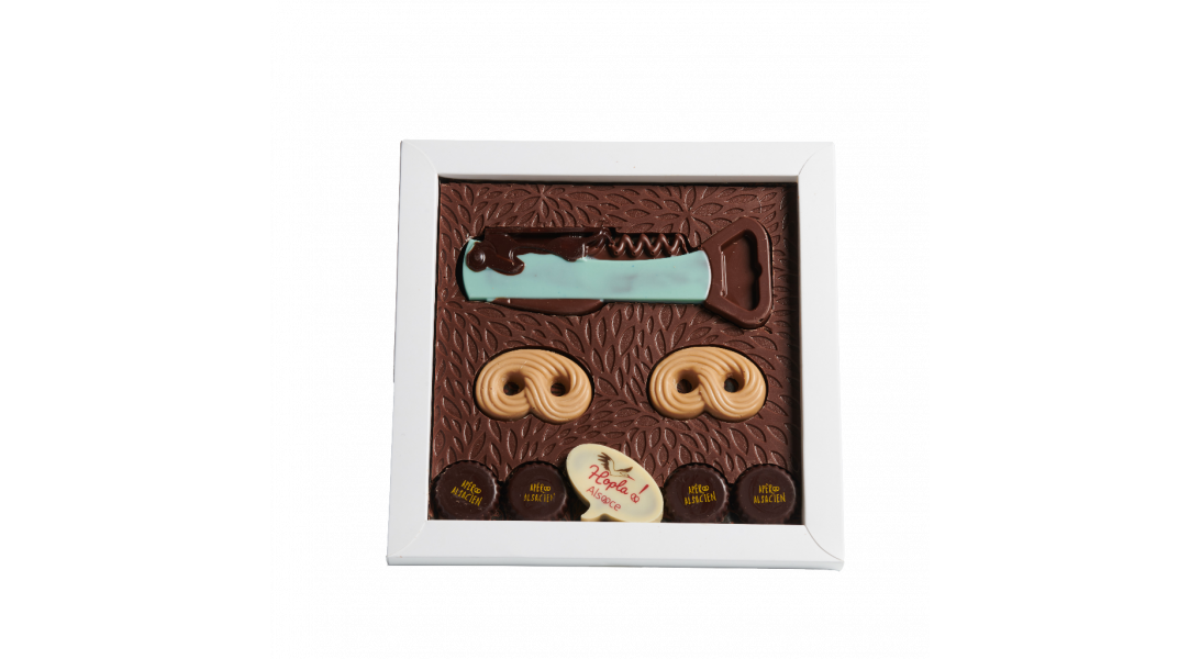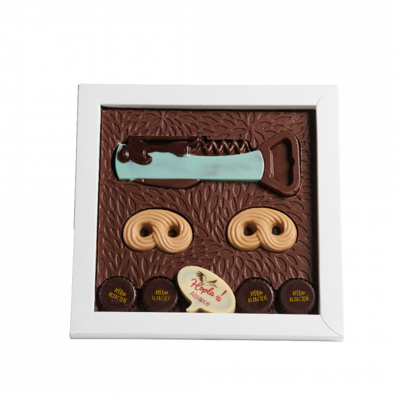 Ingrédients : Chocolat au LAIT (sucre, pâte de cacao, beurre de cacao, poudre de LAIT entier, poudre de LAIT écrémé, émulsifiant: lécithine de SOJA, vanille arômes naturels), Chocolat Blanc Caramélisé (beurre de cacao, sucre, poudre de LAIT entier, poudre de LAIT écrémé, lactosérum en poudre (LAIT), sucre caramélisé (2%), émulsifiant: lécithine de SOJA, arôme, vanille arômes naturels, sel), Chocolat Noir (masse de cacao, sucre de canne, beurre de cacao, émulsifiant : lécithine de SOJA), Praliné Noisette (NOISETTES, sucre, chocolat au LAIT).