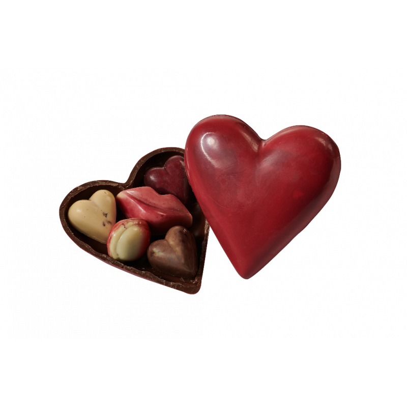 Ingrédients coque (60% cacao) : masse de cacao, sucre, beurre de cacao, émulsifiant : lécithine de SOJA (E322), vanille arômes naturels, colorants naturels selon la couleur du décor, Rouge et Rose (paprika E160c + cochenille E120), Jaune (Lutéine E161b), Vert (Chlorophyle E141i), Orange (paprika E160c) , Bleu (spiruline).